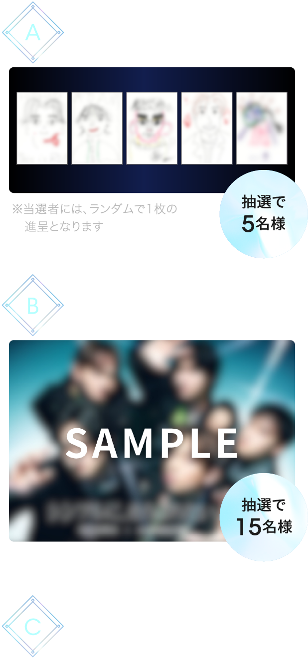 なお、特典A~Cにつきましては、応募者による選択はできず、全てランダムによる振り分けとなります。当選された特典の内容は、賞品の発送をもってお知らせいたします。
